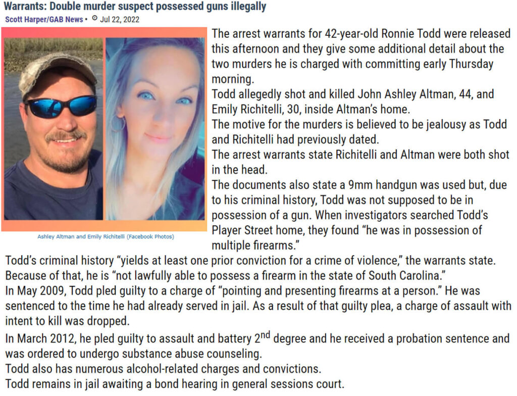 Over the next few days of planning her celebration of life and relying on friends and family for help, I learned of her killer’s criminal history. It is lengthy and filled with acts of violence involving guns and possession of guns illegally. As days unfolded and I had time, I started doing some research, looking for answers. He was on probation for possessing guns as a convicted felon. Yet they discovered 9 weapons on his property. I discovered that he, though arrested many times, had miraculously not served any time in prison. I also took note of the fact that the same local judge sat on many of his cases. I soon discovered this judge is a close friend of the family. That seems very inappropriate to me. Having only lived in Georgetown a few years and working from home, I don’t know a lot of people here. It soon became apparent as many came forward that the locals knew that he had been in trouble his entire adult life and had never really been punished for his many crimes.